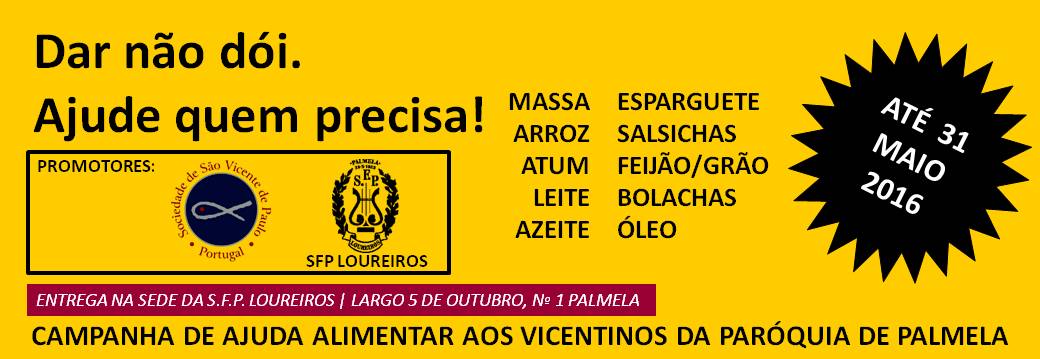 A par das suas próprias actividades a Sociedade Filarmónica Palmelense “Loureiros” encontra-se a promover uma Campanha Solidária (Dar não dói. Ajude quem precisa!) Uma campanha de recolha de alimentos, cujo resultado será entregue aos Vicentinos da Paróquia de Palmela.